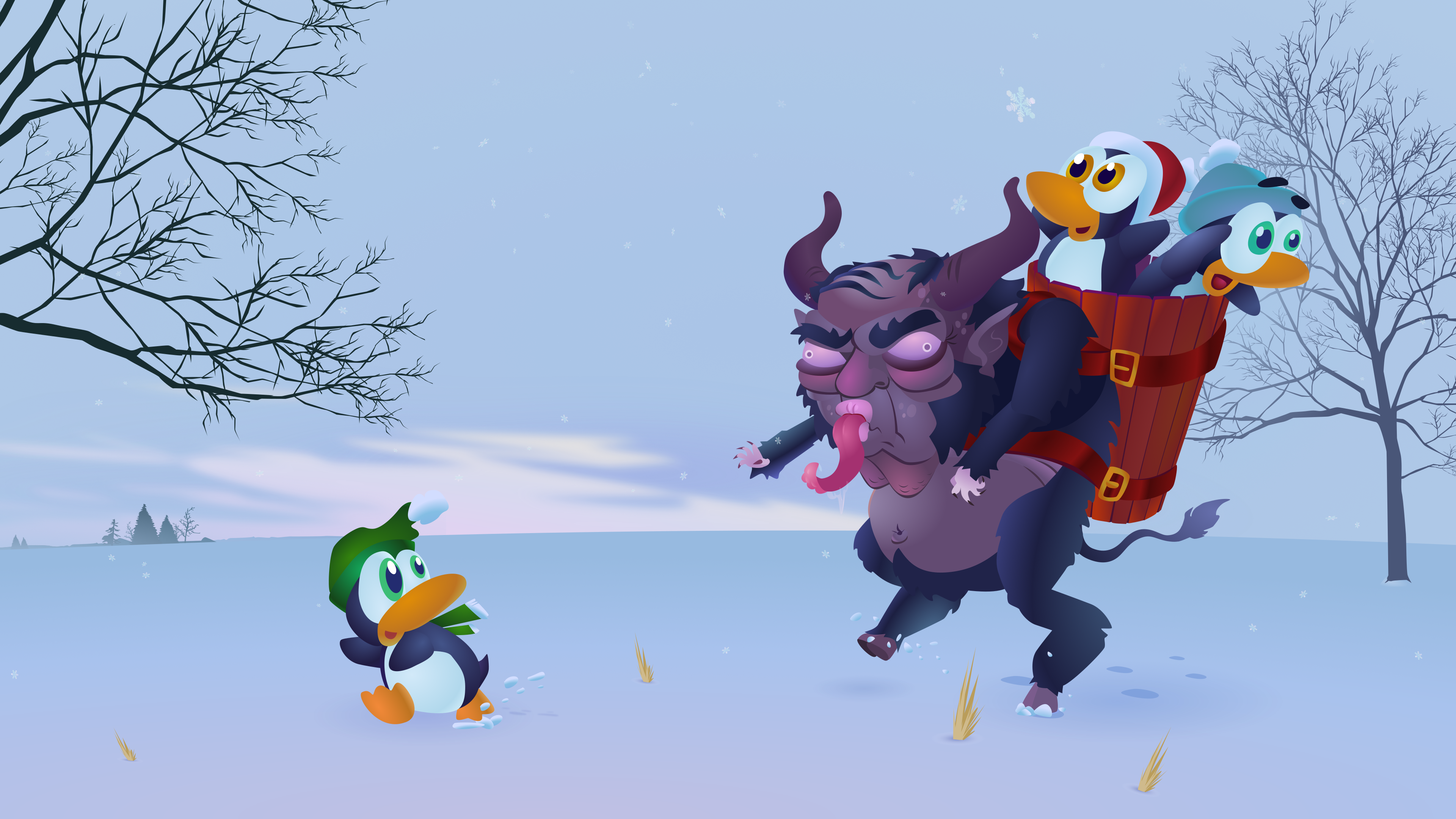 Oh no! Look out! Krampus is on the prowl and he’s grabbing penguins left and right!