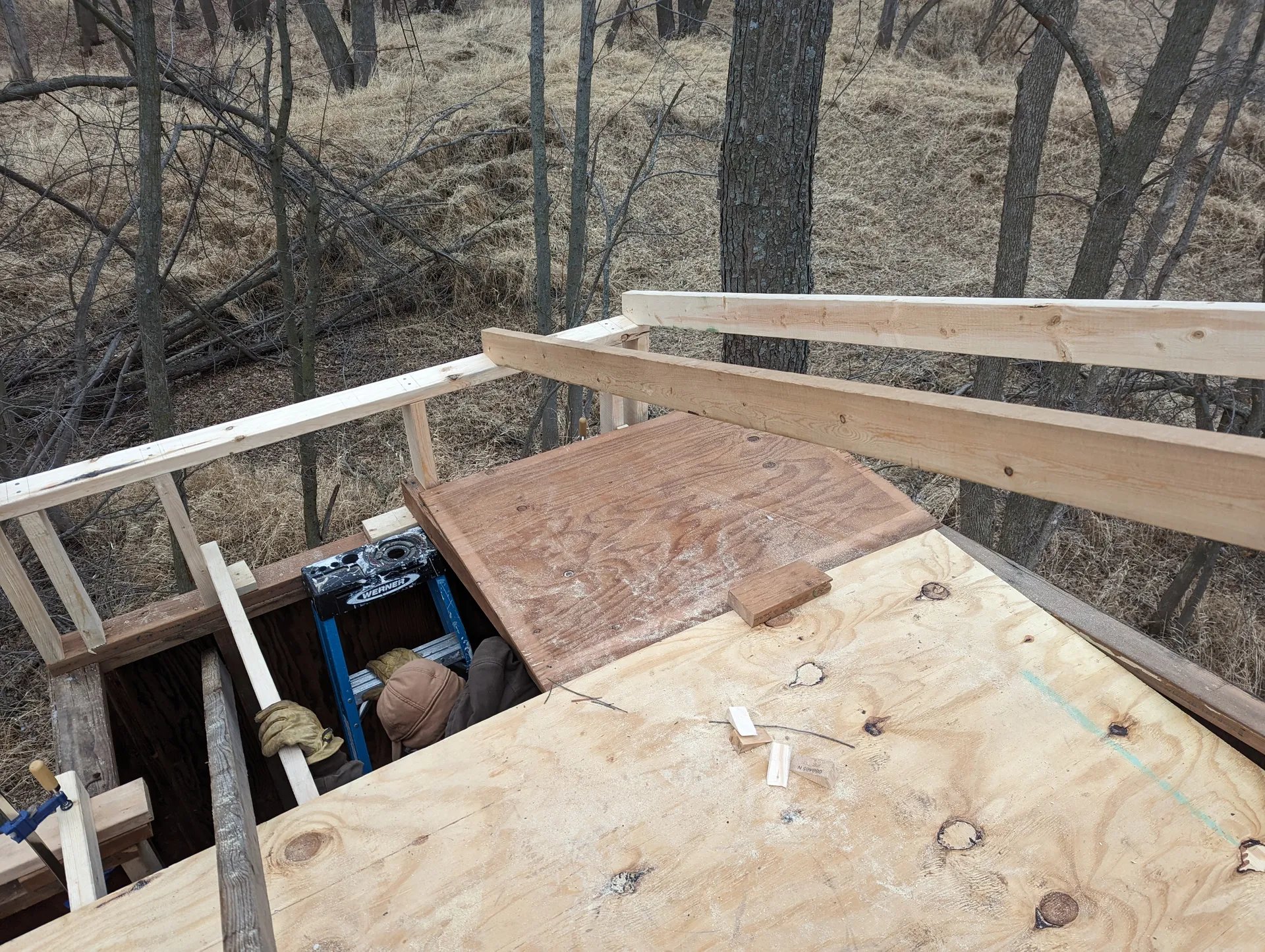 Rafters are also going on, starting on the east side. The added challenge of getting these all to line up across uneven wall sections has been a very cognitively stimulating experience. Our wall sections on the east/west sides have a 6 degree slope, and our roof is around 22 degrees, so all of these upper wall sections involve lots of confusing angled cuts.